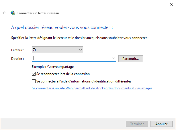 - Cochez Se reconnecter lors de la connexion si vous souhaitez que ce lecteur réseau soit mappé en permanence. Sinon, ce lecteur ne sera pas mappé une fois que l'utilisateur se déconnectera de cet ordinateur. Cliquez ensuite sur Terminer.