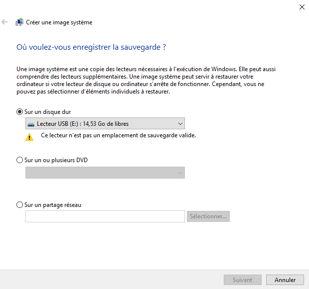 Cependant, lorsque vous choisissez le lecteur flash USB comme disque de destination de sauvegarde de Windows à l'étape "Où voulez-vous enregistrer la sauvegarde ?" Vous verrez un message d'avertissement : "Ce lecteur n'est pas un emplacement de sauvegarde valide".