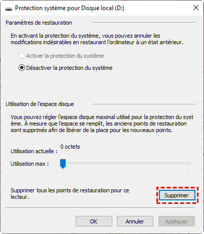 Étape 2. Cliquez sur Supprimer et confirmez l'option pour supprimer tous les points de restauration sur ce disque.