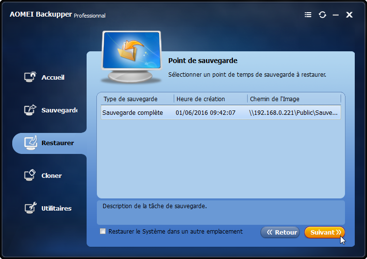 Note : Si vous souhaitez transférer toutes les données du disque dur avec le système inclu, vous pouvez aussi utiliser Sauvegarde de disque. La démarche de restauration est similaire.