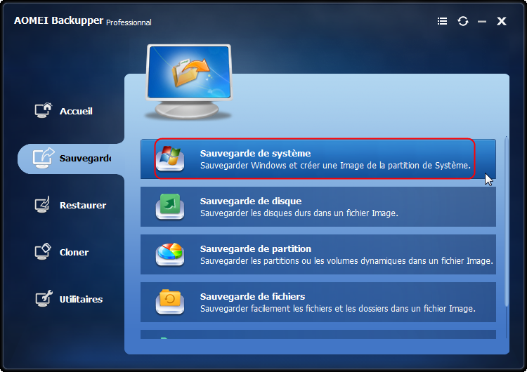 Étape 1. Connectez d'abord un disque dur externe pour stocker la sauvegarde. Lancez AOMEI Backupper et cliquez sur Sauvegarder puis Sauvegarde de Système.