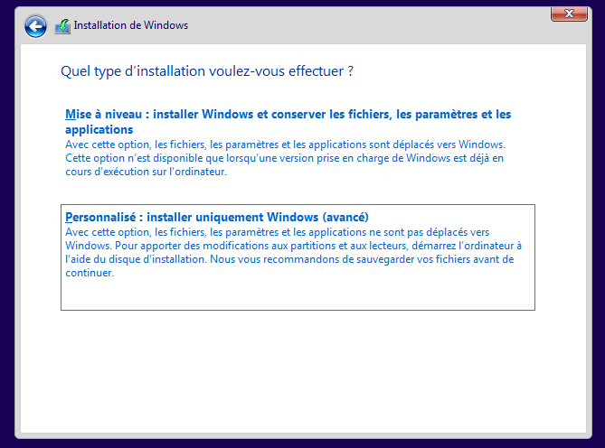 5. Choisissez l’option d’installation personnalisée afin d’accéder à la gestion des partitions et contrôler précisément où le système sera installé.