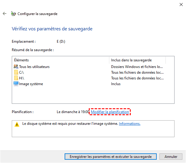 A la page suivante, cliquez sur « Configurer la sauvegarde » -> sélectionnez un disque dur externe pour l'emplacement de votre sauvegarde -> sélectionnez « Me laisser choisir » -> Cochez les éléments sous « Fichiers de données » -> Cochez la partition système et une autre partition sous « Ordinateur » -> cochez « Inclure une image système de lecteur... » et enfin cliquez sur « Enregistrer les paramètres et exécuter la sauvegarde ».