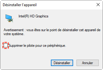 3. Lorsque la boîte de dialogue de confirmation apparaît, cochez Supprimer le pilote pour ce périphérique et cliquez sur Désinstaller.
