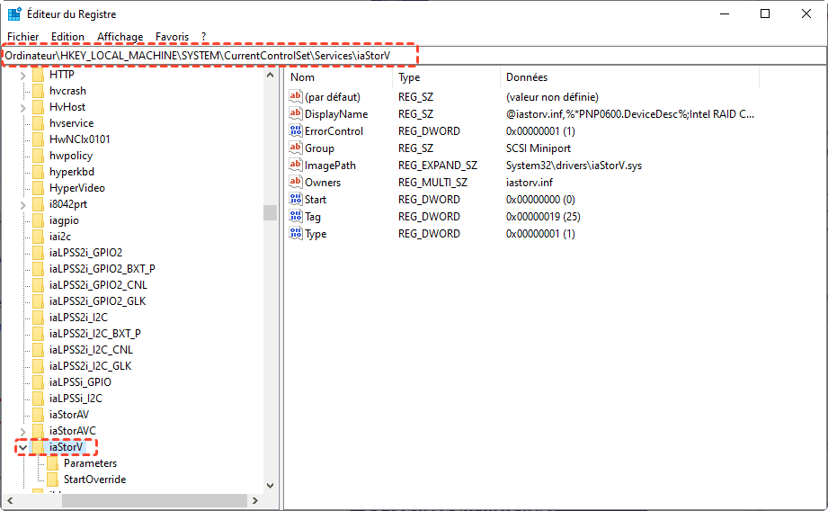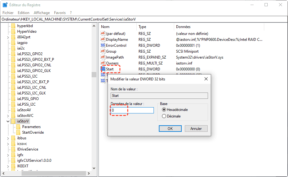 3. Dans le panneau de droite de la clé iaStorV, double-cliquez sur le DWORD Start pour le modifier. Tapez 0 pour AHCI et cliquez sur OK.