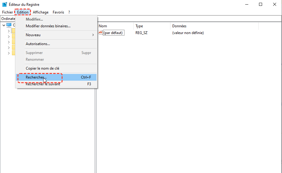 2. Cliquez ensuite sur Edition dans le coin supérieur gauche de l'Éditeur du Registre et sélectionnez Rechercher dans le menu développé.
