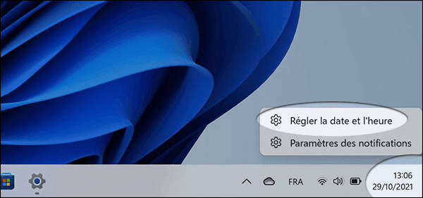 Astuce✍ : Il convient de mentionner qu'un moyen plus rapide de régler l'heure consiste à cliquer avec le bouton droit sur l'horloge dans la barre d'état système et à cliquer sur Régler la date et l'heure dans la fenêtre contextuelle.