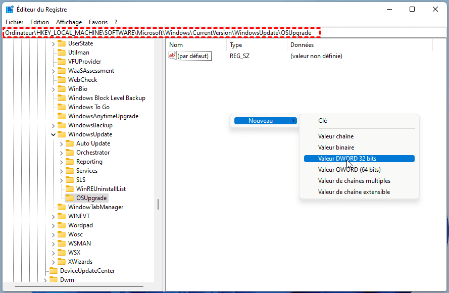 2. Cliquez avec le bouton droit sur l'espace vide sur le côté droit de OSUpgrade. Cliquez sur Nouveau -> Valeur DWORD (32 bits). Nommez-la AllowOSUpgrade.