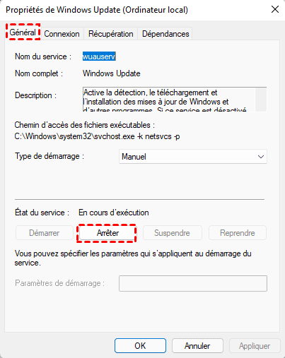 2. Si le processus est en cours d'exécution, cliquez sur le bouton Arrêter, cliquez ensuite sur Appliquer et OK pour enregistrer les modifications.