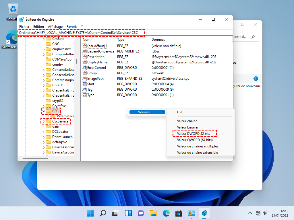 - Pour activer les fichiers hors connexion, définissez la valeur Start de CSC et CscService sur 1 et 2 dans l'ordre.