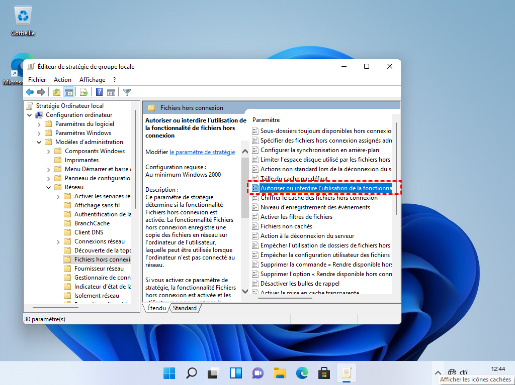 Méthode 3. Activer les fichiers hors connexion dans Windows 11 par l'Éditeur de stratégie de groupe