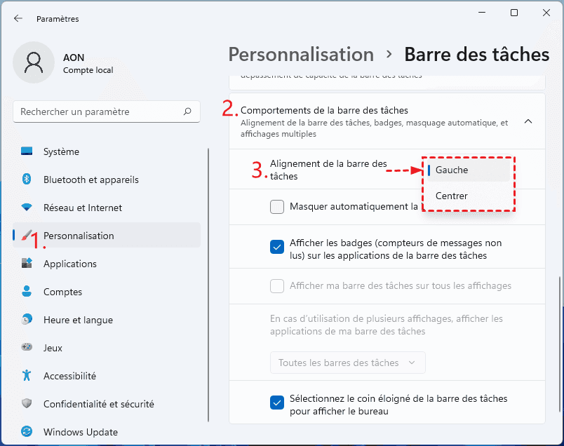 Windows 11 : Changer l'emplacement de la barre des tâches