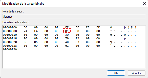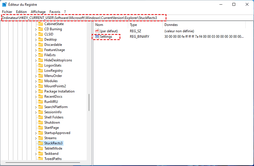 ▶Ordinateur\HKEY_CURRENT_USER\Software\Microsoft\Windows\CurrentVersion\Explorer\StuckRects3