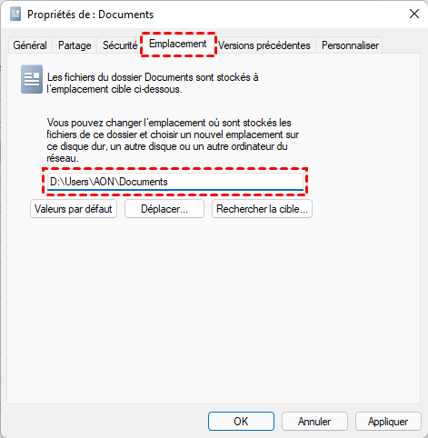 Étape 4. Cliquez sur l'emplacement puis cliquez sur l'option Déplacer pour trouver le nouveau dossier de chemin (ici D:\Documents). Ensuite, cliquez sur OK.