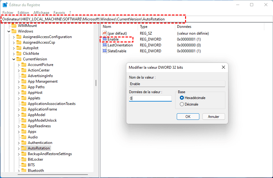 Les étapes pour désactiver la rotation automatique de l'écran via Éditeur du Registre sont les suivantes :