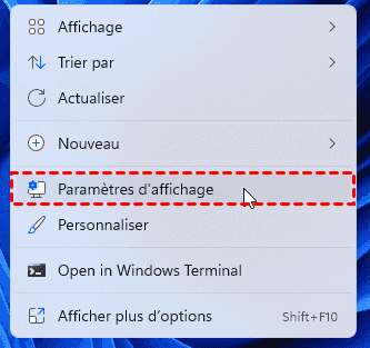 Vous pouvez également ouvrir Affichage de cette manière : ☞ Faites un clic droit n'importe où dans le bureau Windows 11, puis sélectionnez Paramètres d'affichage.