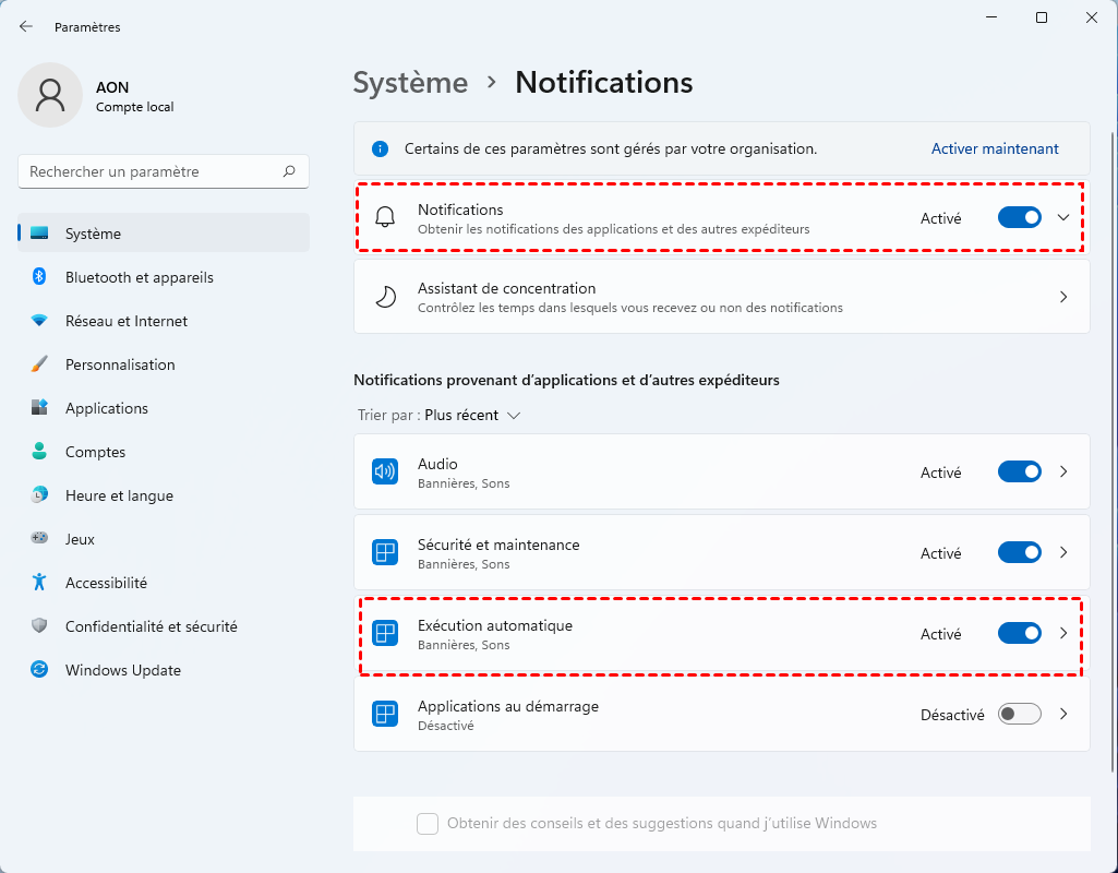 2. Activez d'abord la Notifications, sous Notifications provenant d'applications et d'autres expéditeurs, activez la fonction Exécution automatique.