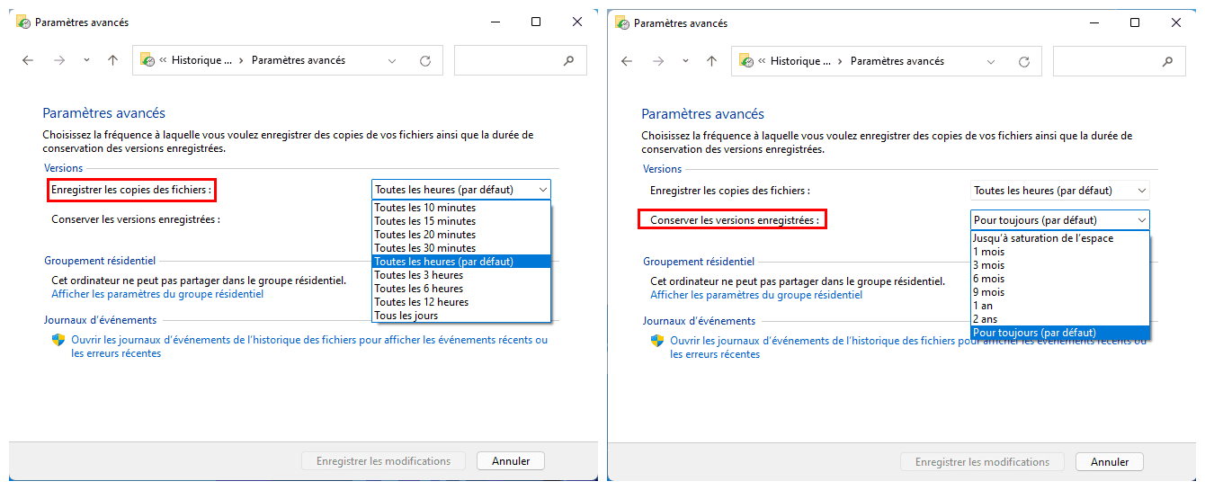 💡Paramètres avancés : Choisir la fréquence de sauvegarde automatique de vos fichiers : cliquez sur "Enregistrer les copies des fichiers" et définissez les versions de sauvegarde que vous souhaitez conserver en cliquant sur "Conserver les versions enregistrées".