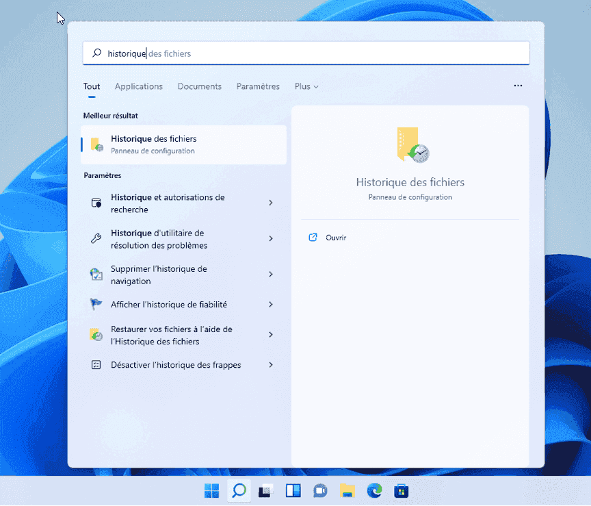 Appuyez sur « win+s », cela ouvrira la fonction de recherche de Windows, entrez « historique des fichiers » et sélectionnez « Ouvrir » pour accéder à cet outil.