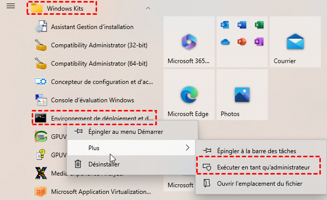 Étape 3. Allez dans Démarrer > Toutes les applications > W et Windows Kit. Cliquez ensuite avec le bouton droit sur Environnement de déploiement et d’outils de création d'image et sélectionnez Plus > Exécuter en tant qu'administrateur.