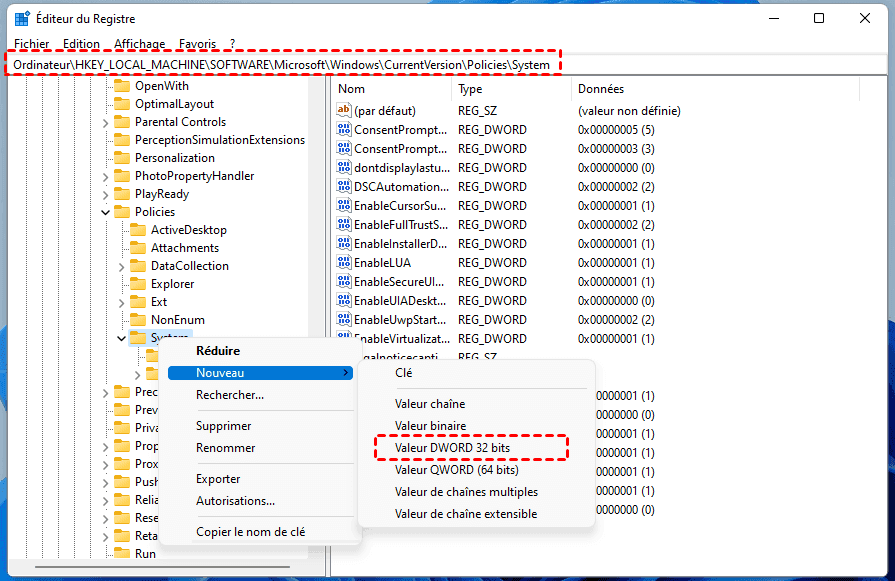 2. Localisez puis cliquez avec le bouton droit sur la sous-clé de registre pour créer une nouvelle valeur DWORD 32 bits :