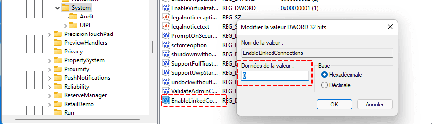 3. Nommez la nouvelle valeur EnableLinkedConnections, puis cliquez dessus avec le bouton droit pour modifier les données de la valeur sur 1. Cela activera le type d'utilisateur administrateur en mode d'approbation administrateur et toutes les autres stratégies de contrôle de compte d'utilisateur (UAC).