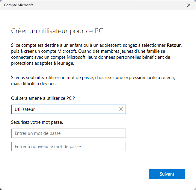 - Entrez un nom d'utilisateur pour le nouveau compte et un mot de passe si nécessaire. Cliquez ensuite sur Suivant. Le nouveau compte utilisateur va maintenant être créé.