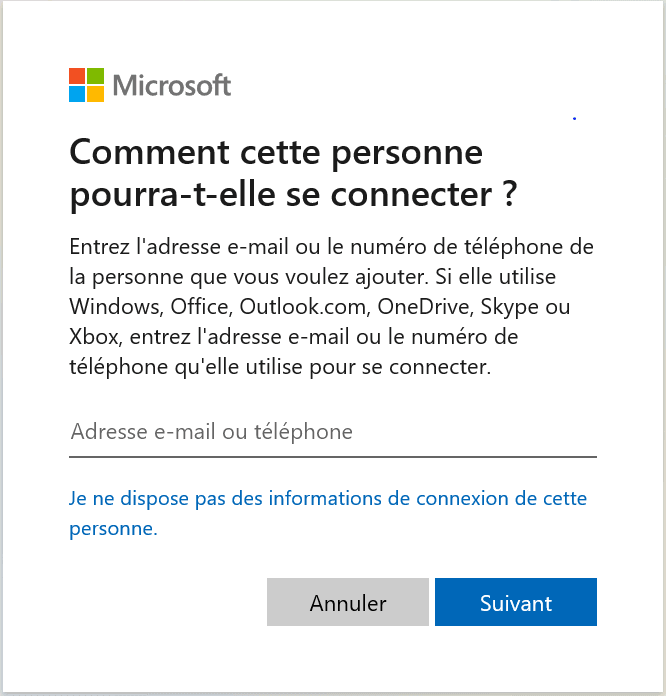 - Dans l'écran suivant, sélectionnez Je n'ai pas des informations de connexion de cette personne.
