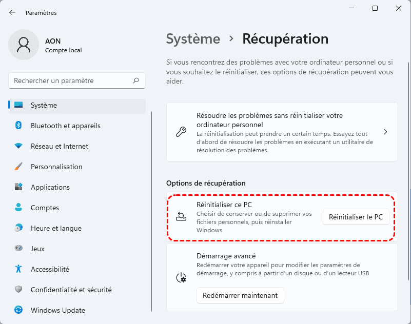 - Allez dans Système -> Récupération. Cliquez sur Réinitialiser ce PC sous Options de récupération.
