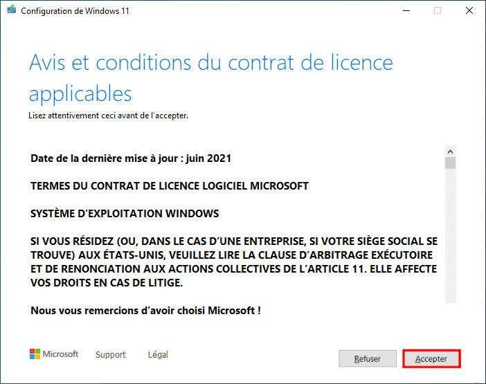 3. Si cet outil confirme que le matériel de votre PC est compatible, acceptez les termes de la licence en cliquant sur le bouton Accepter et installer.