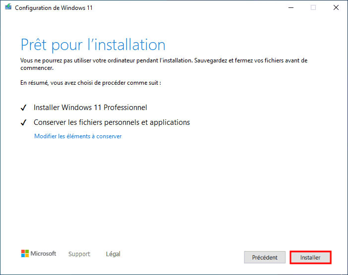 - Vous serez informé de la version de Windows 11 qui sera installée et des données que vous conserverez. Confirmez et cliquez sur Installer. Ou cliquez sur Modifier les éléments à conserver pour faire quelques changements.