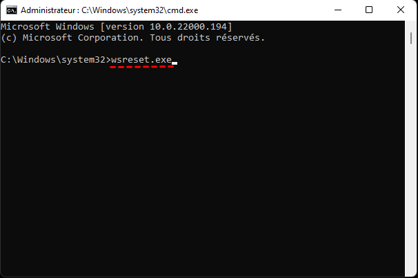 Étape 2. Lorsque vous êtes dans l'interface d'invite de commande élevée, tapez wsreset.exe et appuyez sur Enter pour réinitialiser le Microsoft Store.