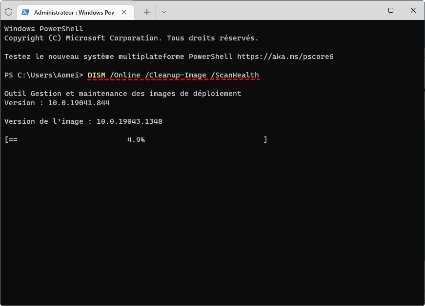 Étape 1. Ouvrez un autre terminal Windows (comme à l'étape 1) et exécutez une analyse DISM en tapant la commande DISM /Online /Cleanup-Image /ScanHealth et appuyez sur Enter.