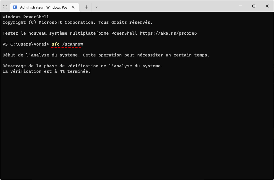 Étape 2. Dans la fenêtre du terminal Windows, tapez sfc /scannow et appuyez sur Enter pour exécuter un vérificateur de fichiers système.