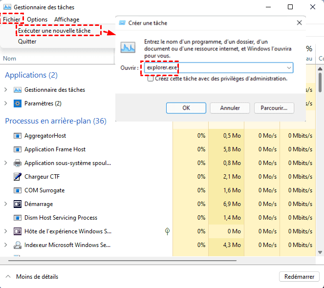 - Cliquez sur l'option « Fichier » en haut à gauche du « Gestionnaire des tâches », puis sélectionnez « Exécuter une nouvelle tâche », entrez « explorer.exe » et cliquez sur le bouton « OK ».