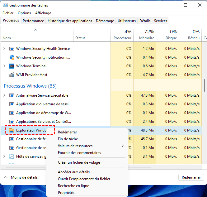 - Sous l'onglet « Processus », recherchez « Explorateur Windows » et cliquez dessus avec le bouton droit de la souris, puis sélectionnez « Fin de tâche » dans le menu développé.