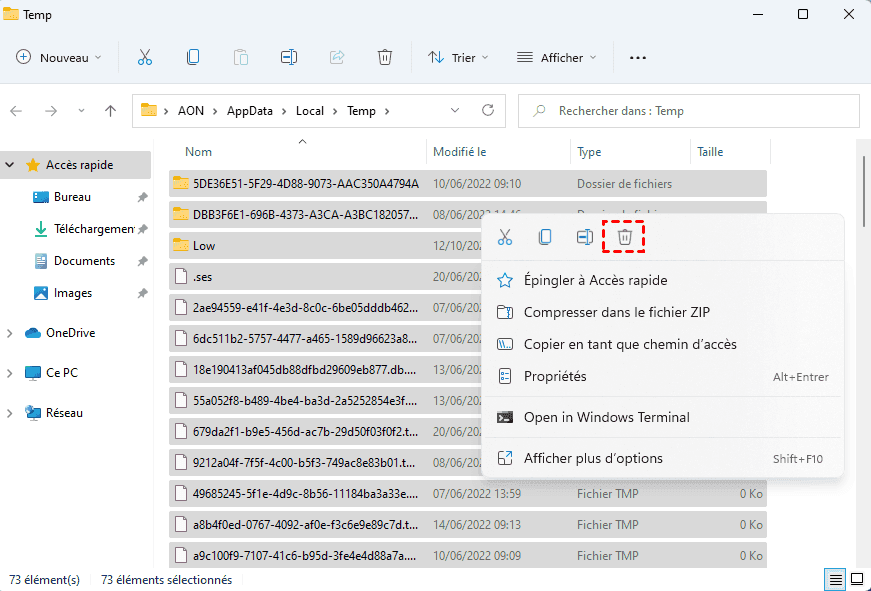 - Appuyez sur Ctrl + A pour sélectionner tous les fichiers temporaires, cliquez avec le bouton droit sur l'un des dossiers et sélectionnez l'icône « Supprimer » dans le menu développé.
