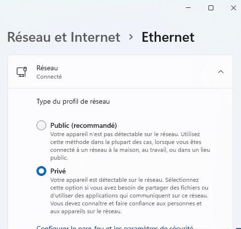 Astuce ✍ : Le profil Privé permettra la découverte des appareils de votre réseau, ce qui convient à la maison, aux lieux de travail et aux réseaux de confiance. Si vous choisissez le profil Public, votre appareil n'est pas détectable sur le réseau.