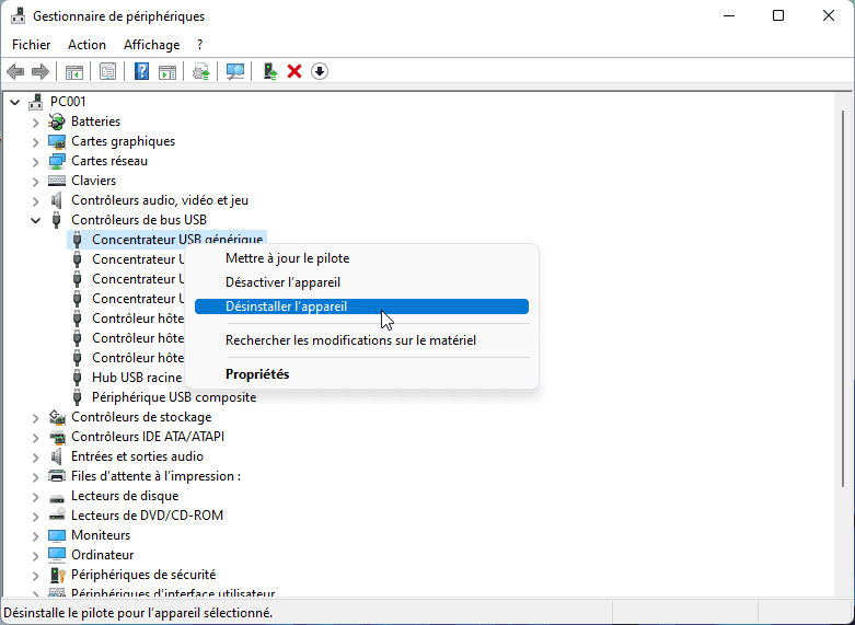 3. Développez la section Contrôleurs de bus USB et désinstallez tous ses sous-pilotes.