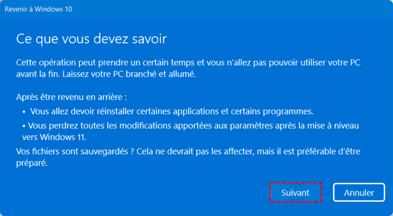 Remarque : Vous devez sauvegarder les fichiers créés après la mise à niveau vers Windows 11, car le processus de rétrogradation peut les supprimer.