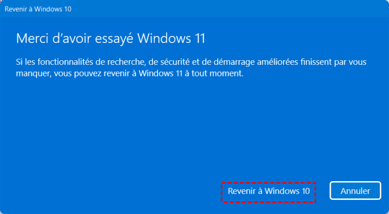 Veuillez noter que Windows 10 est pris en charge par Microsoft jusqu'au 14 octobre 2025. Certaines conditions doivent être remplies pour revenir à Windows 10. Vous ne pouvez rétrograder à Windows 10 que dans les 10 jours suivant la mise à niveau. Si vous ne remplissez pas les conditions ci-dessus, pour revenir à Windows 10, vous devrez effectuer une nouvelle installation de Windows 10.