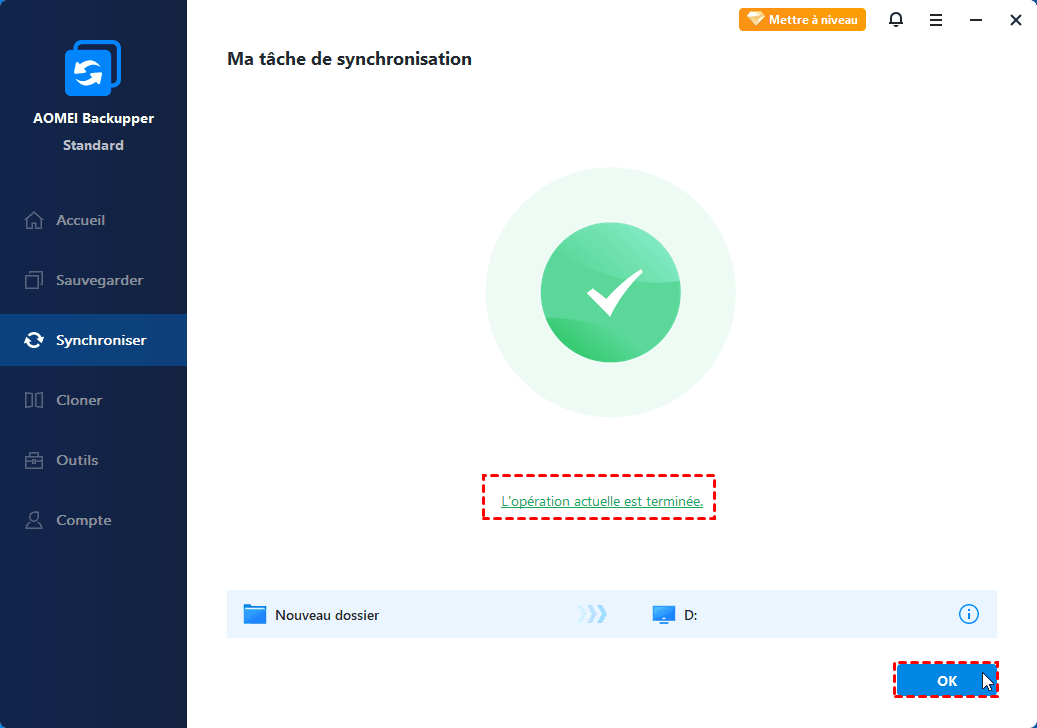 AOMEI Backupper Standard est un logiciel gratuit qui permet de sauvegarder, de restaurer et de cloner des fichiers. Il propose également une fonction de Synchronisation de base qui vous permet de synchroniser des dossiers vers d'autres emplacements, tels que des disques durs externes, des NAS, des clés USB, etc. Cette fonction est similaire à la fonction « Copier » de Windows, et ne crée aucune image de fichier après la fin du processus de synchronisation, ce qui vous permet de visualiser le contenu à tout moment.
