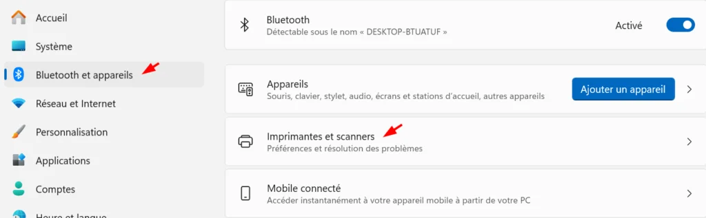 Étape 3. Allez dans Paramètres > Périphériques > Imprimantes et scanners. Vérifiez si votre scanner est visible.