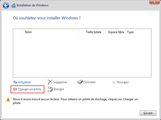 Si vous constatez que Windows ne peut pas trouver de lecteurs lors de l'installation de Windows 11 et qu'il vous alerte avec le message « Nous n'avons trouvé aucun lecteur », veuillez cliquez sur Charger un pilote pour essayer de charger les pilotes appropriés pendant le processus d'installation de Windows.