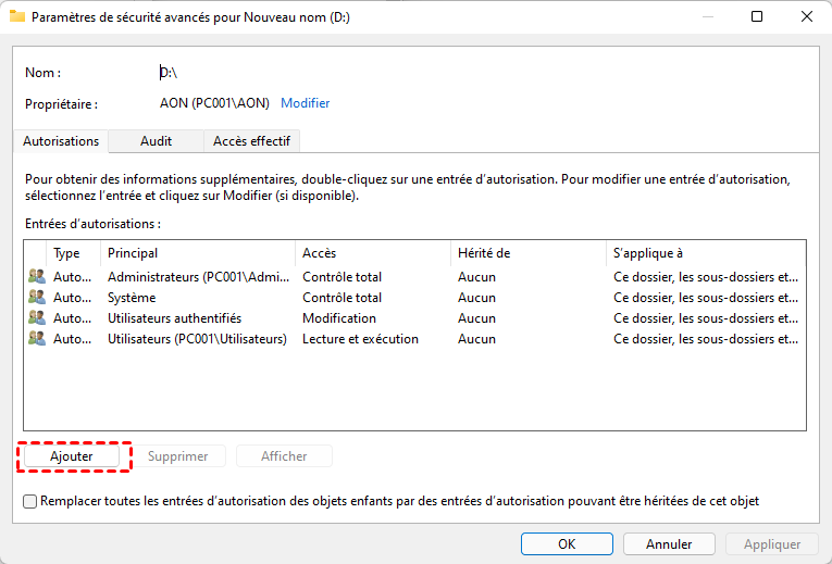 6. Cochez l'option Remplacer le propriétaire des sous-conteneurs et des objets. Cliquez ensuite sur Appliquer et sur le bouton OK. Cliquez à nouveau sur le bouton OK lorsque la fenêtre contextuelle vous y invite.