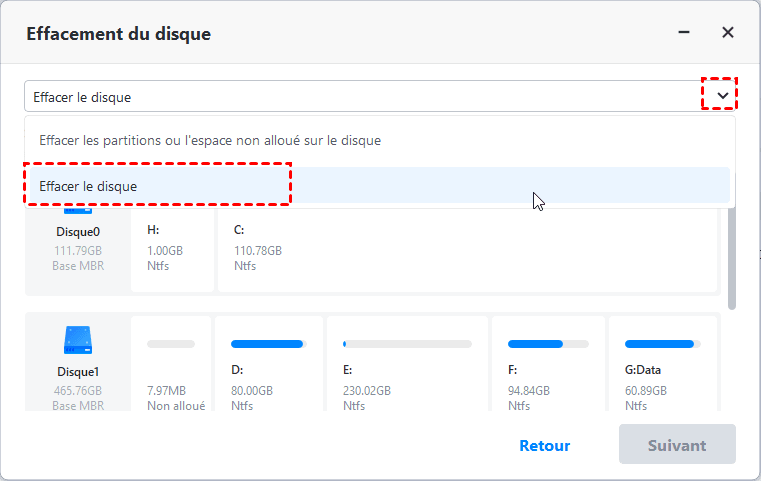 Étape 2. Dans la fenêtre Type d'effacement, sélectionnez Effacer le disque pour supprimer toutes les partitions et effacer tous les secteurs du disque, puis cliquez sur Suivant.