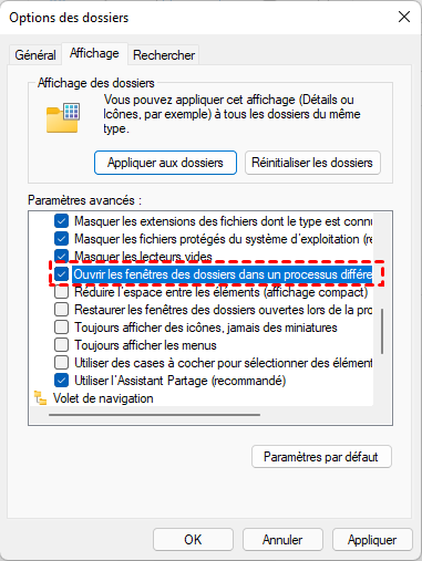 3. Dans la liste des paramètres avancés, recherchez et cochez Ouvrir les fenêtres des dossiers dans un processus différents. Cliquez à nouveau sur le bouton OK pour enregistrer les modifications actuelles.