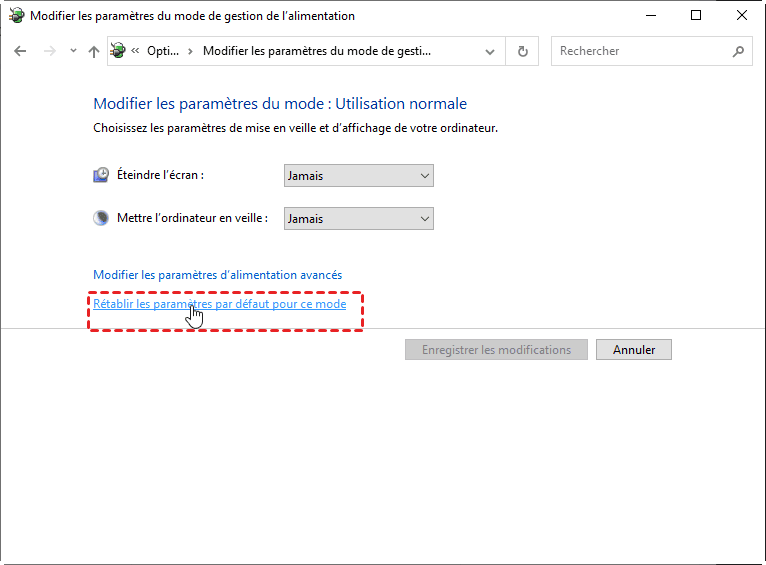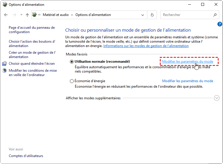 1. Dans Option d'alimentation, cliquez sur Modifier les paramètres du mode.