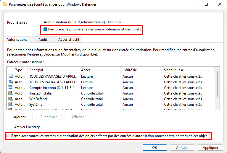 Étape 5. Cochez maintenant les cases Remplacer le propriétaire de son sous-conteneurs et des objets et Remplacer toutes les entrées d'autorisation des objets enfant par des entrées d'autorisation pouvant être héritées de cet objet, puis cliquez sur Oui dans le message d'avertissement de sécurité Windows qui s'affiche.