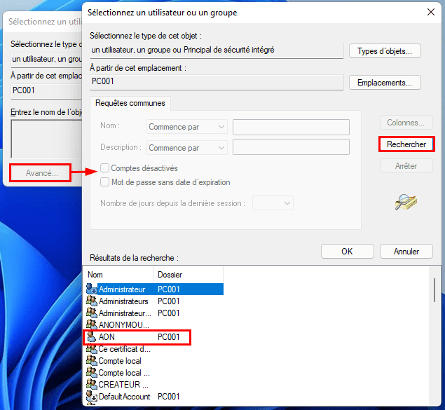 Étape 4. Une fois qu'une autre fenêtre s'ouvre, cliquez sur Avancé -> Rechercher. Sélectionnez le compte Administrateur ou le groupe Administrateur et cliquez sur OK. Cliquez ensuite sur OK une fois de plus pour confirmer les modifications.